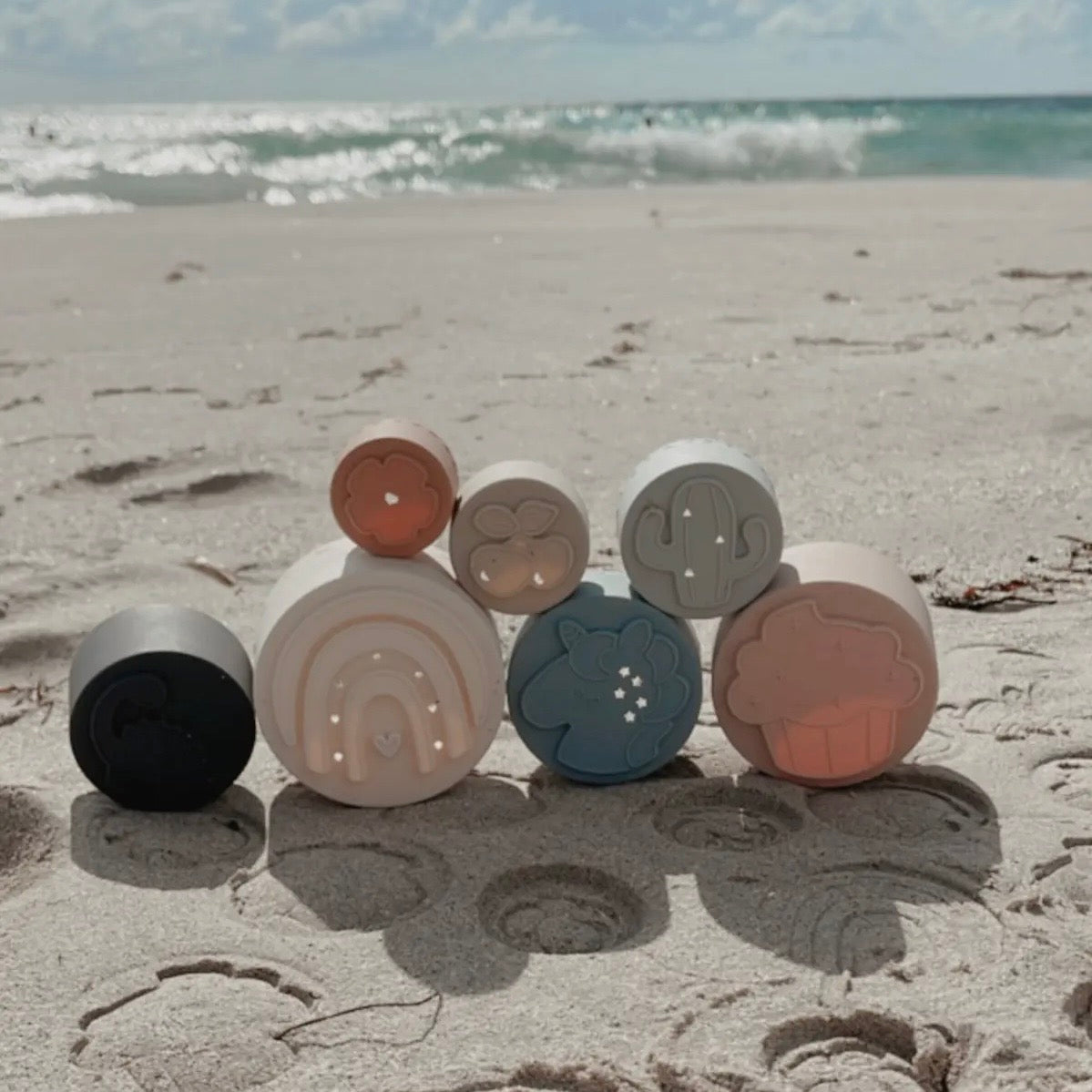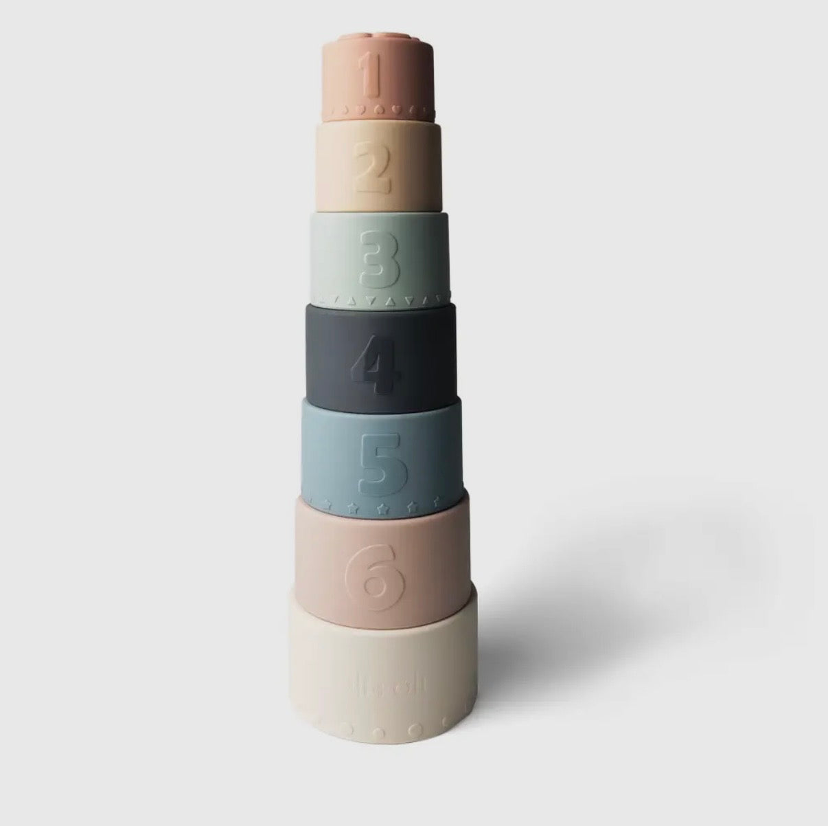 Our large silicone Stacking Cups are the perfect multifunctional toy for your baby's development. The cups encourage fine motor skills, coordination, and recognition of colors and size. Each set includes 7 soft silicone cups with shapes cut into the bottom which makes them a fun toy to use in the bath, beach, or just in a playroom.